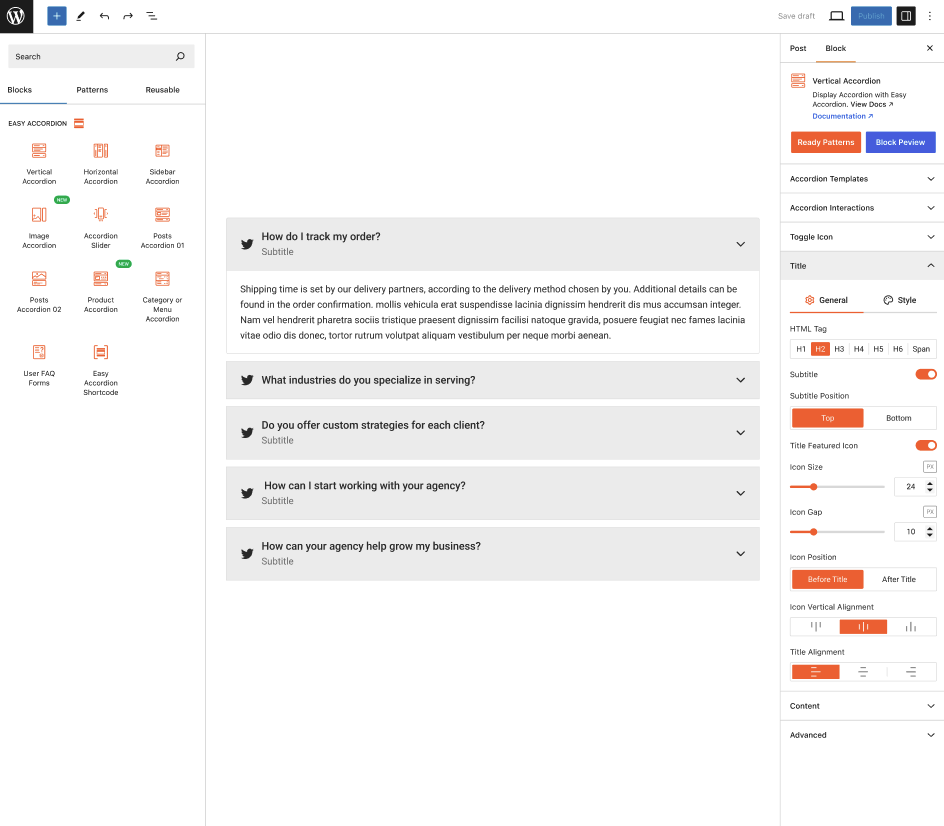 Easy Accordion includes 10+ dedicated Gutenberg block for seamless editing. Users can insert, customize, and preview accordions directly within the block editor. It also works well with builders like Elementor, Divi, and Beaver Builder through shortcode support.